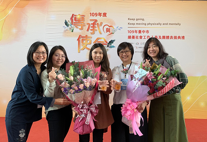 兒童發展啟蒙資源中心林純純副組長(右2)獲績優社工獎;犁頭店婦女福利服務中心邱姿瑜社工師(右3)獲新銳社工獎