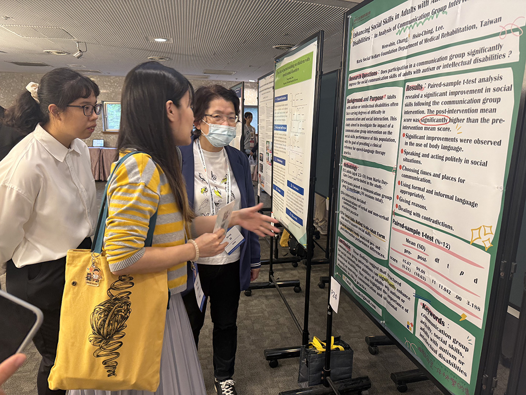| 語言治療師張芠馨於2025第二十七屆亞洲智能障礙聯盟大會(AFID)發表海報論文,主題為「The Effects of Communication Group Activity on social skills of adults with disabilities」(中譯:成人自閉症與智能不足個案之社交技巧促進:一項溝通團體活動成效分析)。 |