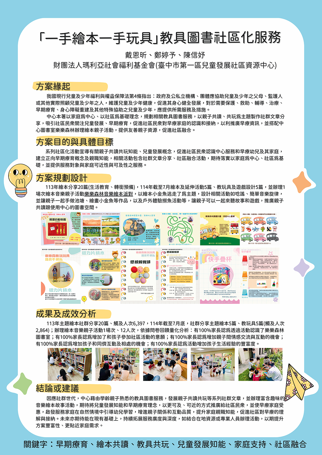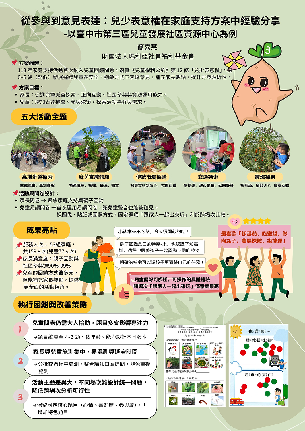 本會承辦臺中市第三區兒童發展社區資源中心 簡嘉慧社工師參與「第26屆兒童發展早期療育國際論文發表大會」入選服務方案成果海報式論文發表 1.題目:以〈從參與到意見表達:兒少表意權在家庭支持方案中經驗分享—以臺中市第三區兒童發展社區資源中心為例〉 2.論文內容摘要: 「薯夏童樂遊—親子互動活動」家庭支持方案,以社區為基礎,結合自然探索、食農體驗、交通與市場探索等多元主題,促進家庭在生活場域中的親子互動與感官學習。鼓勵0至6歲發展遲緩及身心障礙兒童家庭透過感官探索與親子互動,共同成長。為落實《兒童權利公約》第12條兒少表意權精神,方案中導入「兒童回饋問卷」,以圖像、貼紙及圈選等易讀設計,協助兒童表達參與感受。 3.結果:兒童對可操作、具體體驗的活動最具興趣,並呈現出「與家人一起玩」題項的高度滿意度。 4.結論:此回饋機制除補充家長觀點,也讓中心逐步建立尊重兒童意見的服務模式,未來將持續優化問卷設計與施測方式,使兒童聲音更具影響力,持續推進早療服務向「與兒童同行」的理念邁進。