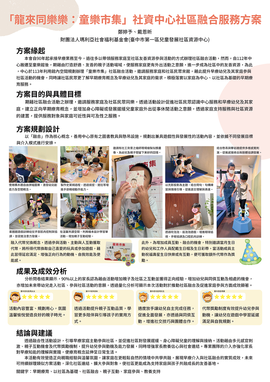 本會承辦臺中市第一區兒童發展社區資源中心 鄭婷予、戴恩昕社工師參與「第26屆兒童發展早期療育國際論文發表大會」入選服務方案成果海報式論文發表 1.題目:「龍來同樂樂:童樂市集」社資中心社區融合服務方案 2.論文內容摘要:「龍來同樂樂:童樂市集」社資中心社區融合服務方案辦理目的為藉社區融合活動共邀服務家庭及社區民眾一起同樂,透過遊戲及活動設計,促進社區民眾認識中心服務和早療幼兒及其家庭,並增加身心障礙或發展遲緩兒童家庭外出從事休閒活動之意願。 3.結果:分析服務成效顯示,童樂市集社區融合活動以融合為核心,結合以家庭為中心、以社區為基礎的服務理念,透過融合性活動設計,引導早療家庭主動參與社區,並促進社區對發展遲緩、身心障礙兒童的理解與接納。展現早療介入與社區融合的實質成效,使社區更能成為支持家庭與孩子共融成長的友善基地。