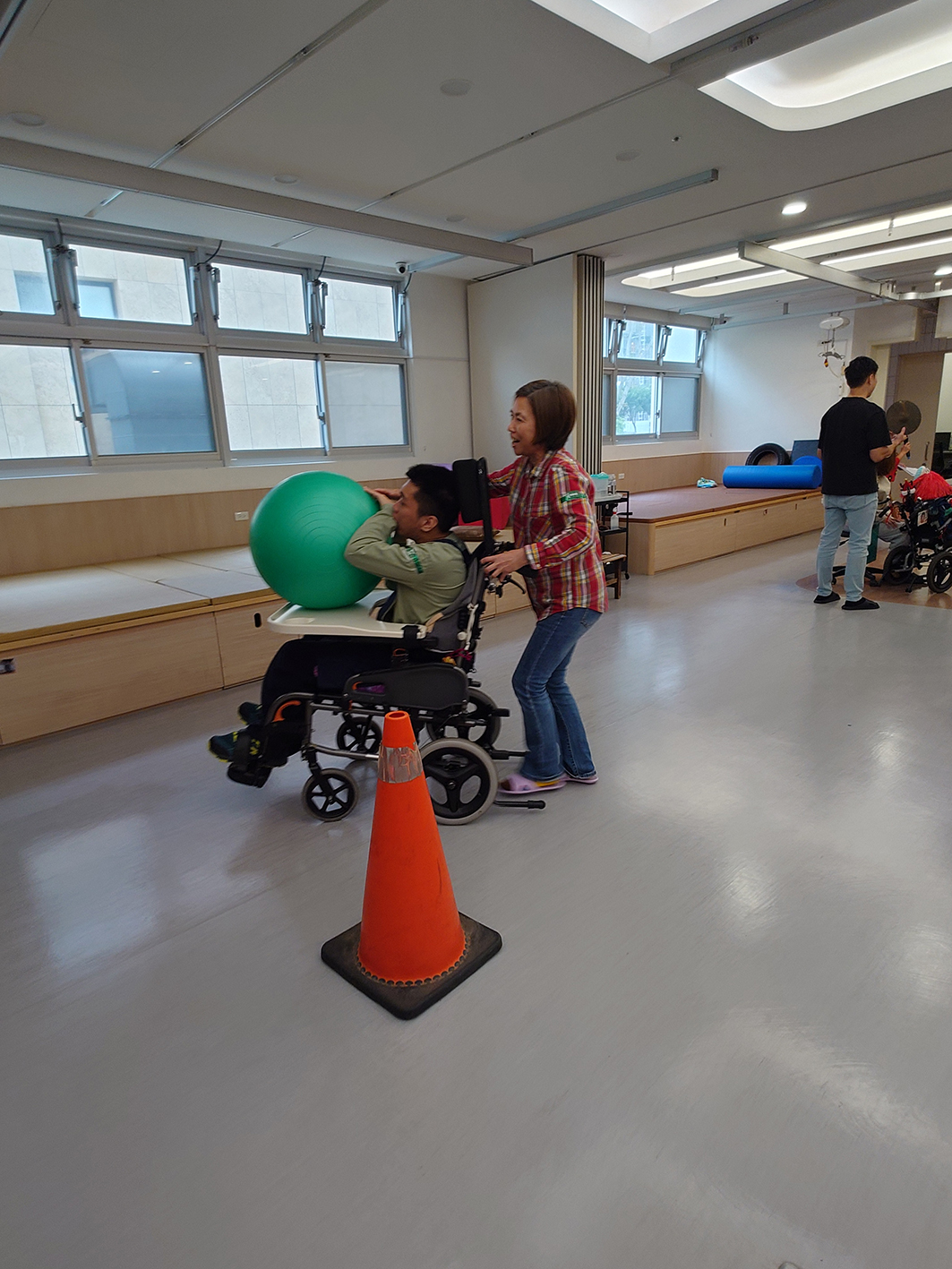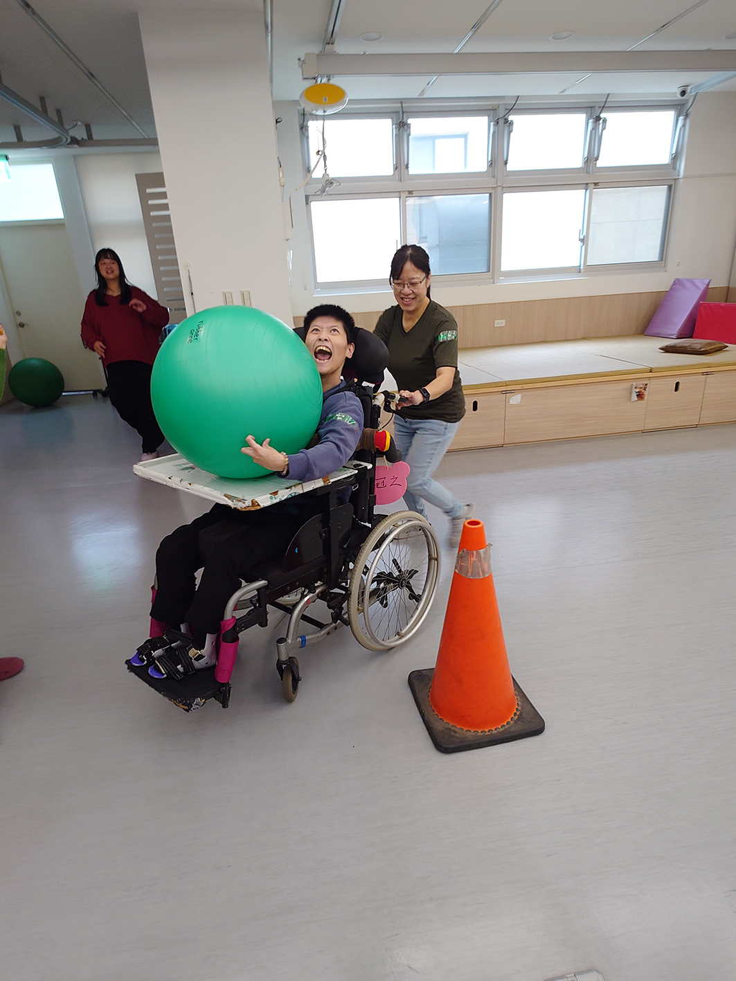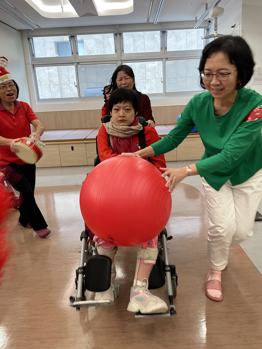 球很大,抱起來並不容易。有服務對象需要被扶著走,有些在輪椅上被穩穩地推著前進,也有人用力把球抱在懷裡,有人則和身邊的支持者一起抓緊它。移動的速度不一樣,方式也不一樣,但方向是一樣的。
