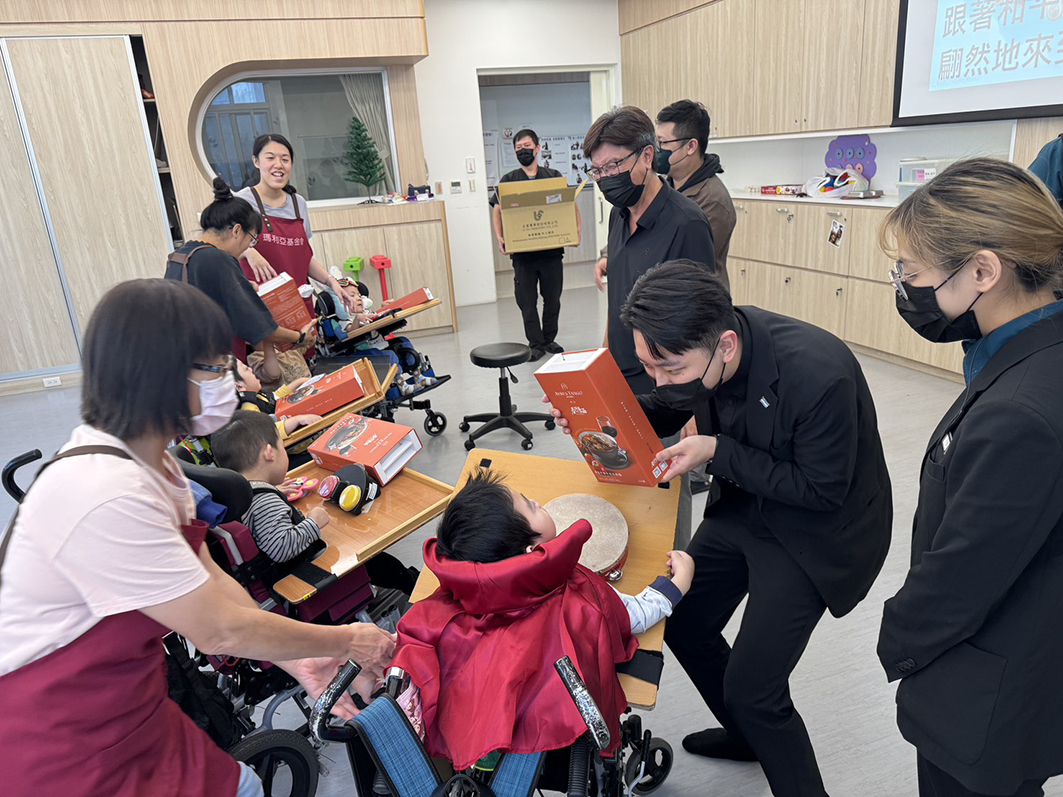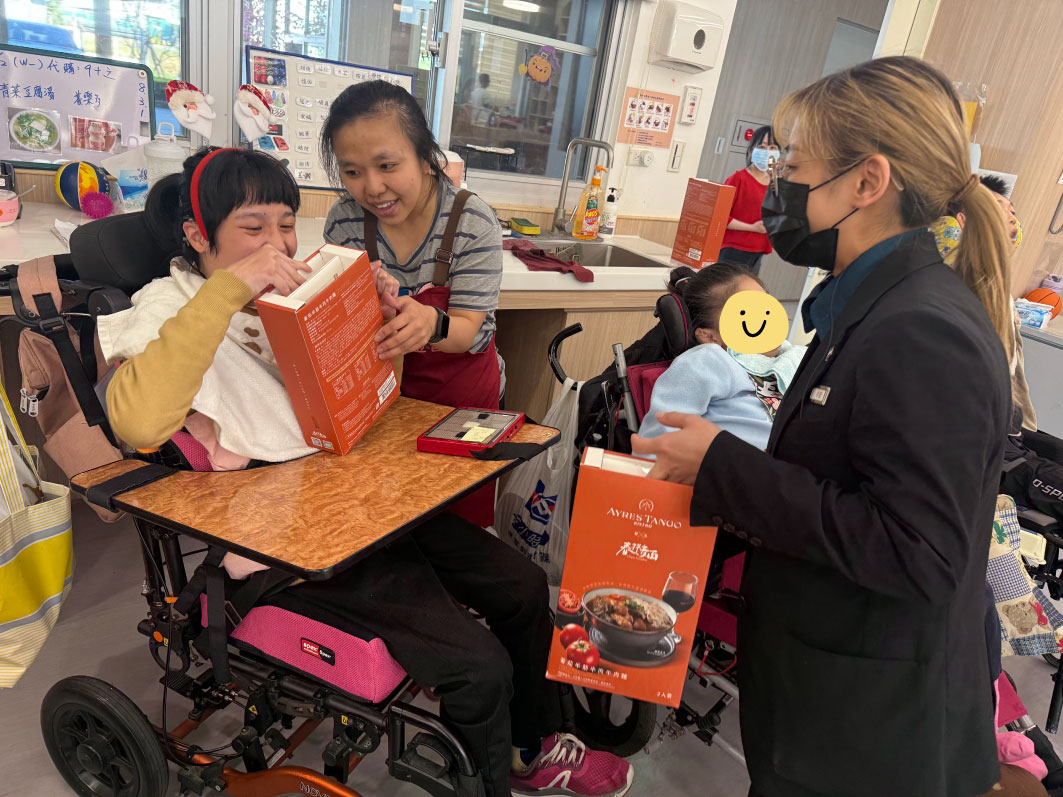 先生賢伉儷,帶領主管與同仁為瑪利亞學園服務對象準備暖心點心,讓最愛吃麵的小瑜笑得合不攏嘴,大家都好開心。