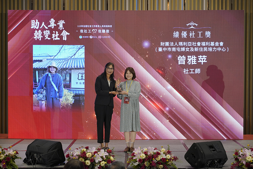 恭賀本會承辦 臺中市南屯婦女及新住民培力中心 曾雅苹社工師 臺中市第一區兒童發展社區資源中心 戴恩昕社工師 榮獲衛生福利部115年全國社會工作專業人員績優社工獎,衛生福利部於3月31日進行表揚頒獎。