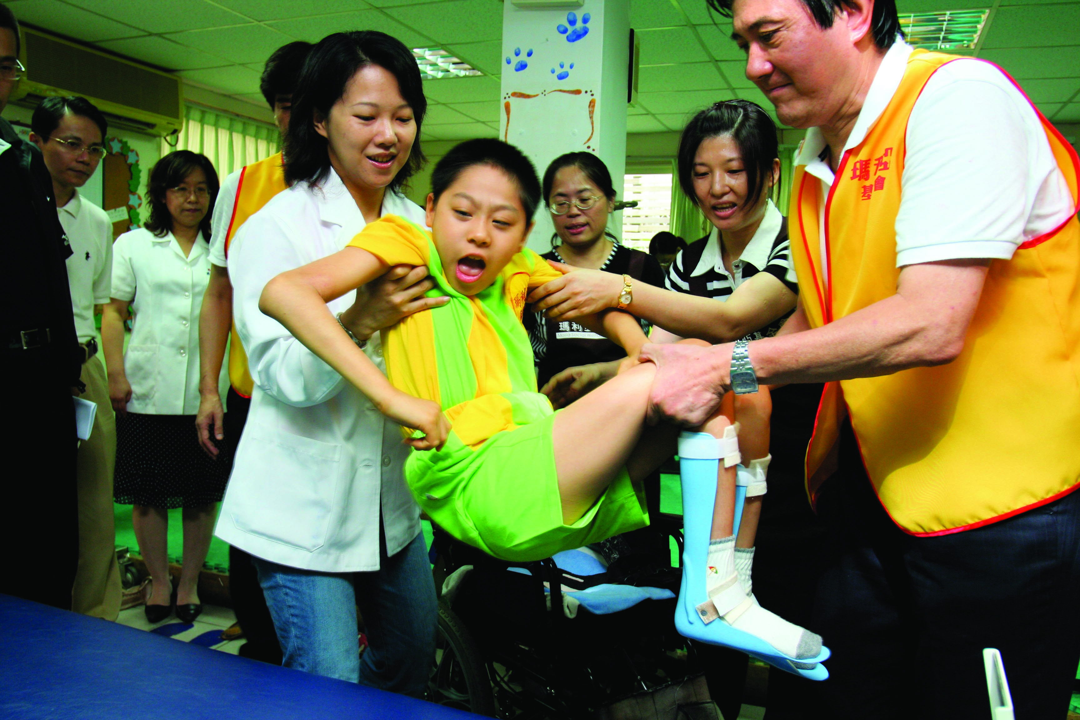 馬英九叔叔今天來到瑪利亞啟智學園擔任實習志工,協助園生進行物理治療,首先幫孩子穿上足托板(其作用幫助穩定關節角度,抑制不正常肌肉張力)後,再與治療師一起從輪椅將孩子抱到傾斜床(其作用是讓身體承受重力訓練站立能力及增加骨質密度),雙腳再綁上腳部副木(其作用固定膝關節打直),綁帶固定後,馬叔叔啟動開關讓園生開始站立訓練,這時用心作完每個動作的馬叔叔已經滿頭大汗了! 馬叔叔擔任實習志工,實地關懷重度腦性麻痺兒童的早期療育,今天除致贈兒童玩具外,更率先捐出7萬元號召籌募擴建啟智學園經費,在陪同的黃義交委員、陳玉梅議員、洪嘉鴻議員、邱淑緹局長、林昭燦先生、薛香川先生、王韻菁小姐、台中市家長協會、博愛基金會共同響應下,短短幾分鐘就募集了20多萬元捐款,讓我們欣喜不已。 馬英九在離去前表示,社會上有身心障礙的兒童很多,除了政府要予以協助外,社會各界也要有同理心,一起努力來幫助這些兒童進行早期療育。 |