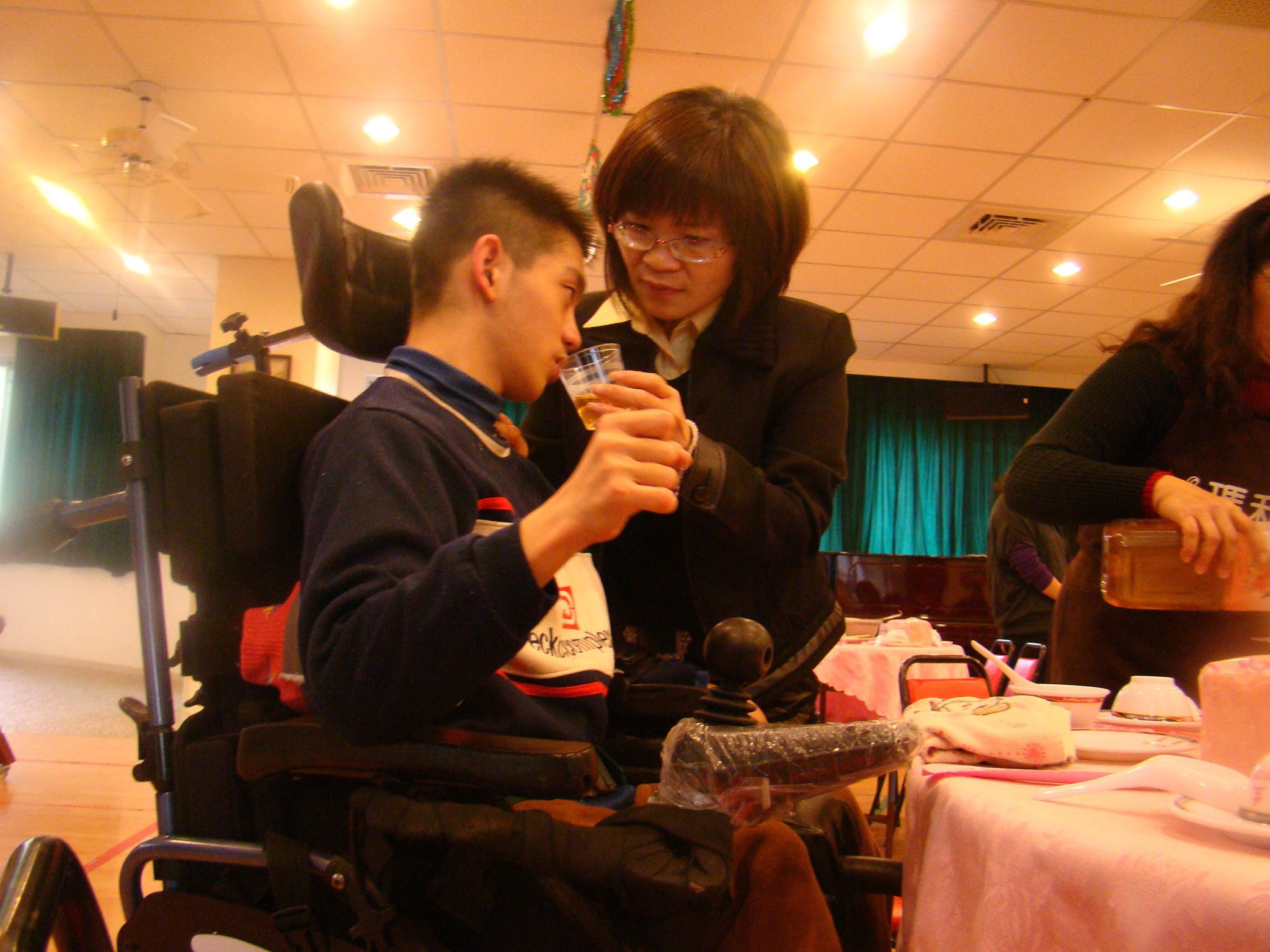 市長親切地為表演太鼓的服務對象挾菜,害羞的小沛坐在市長身旁,言語雖不能表達,但看得出來難掩興奮之情,濃濃的當歸香、甜甜的八寶飯,好豐盛的一餐、好溫馨的家園。 霧峰家園每年均有服務對象因家庭功能喪失或已無家人等因素無法返家,如:小君的媽媽因領有精神障礙手冊安置於療養院,爸爸於多年前因病辭世,每年小君最期盼的就是過年的時候,因為舅舅會帶著媽媽至園區探望她,就會讓她高興許久;另一位服務對象小忠,父母於多年前突然意外辭世,父母離開後兄姐也失聯,由社會局將小忠安置於家園,曾試著找尋姊姊的消息,但經過一番努力仍音訊全無,因為小忠非常想念姊姊,每年的新希望就是可以見到姊姊一面;其他還有許多服務對象因家庭因素,無法與最親近的家人在一起過年,因此每年都特別舉辦「歲末寒冬圍爐活動」,陪伴他們一起迎向新年的到來,提前感受過年歡樂的氣氛! |