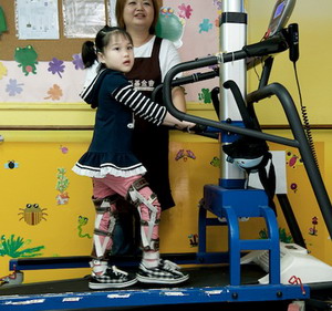 菁菁在復健老師的陪同下持之以恆地做復健。